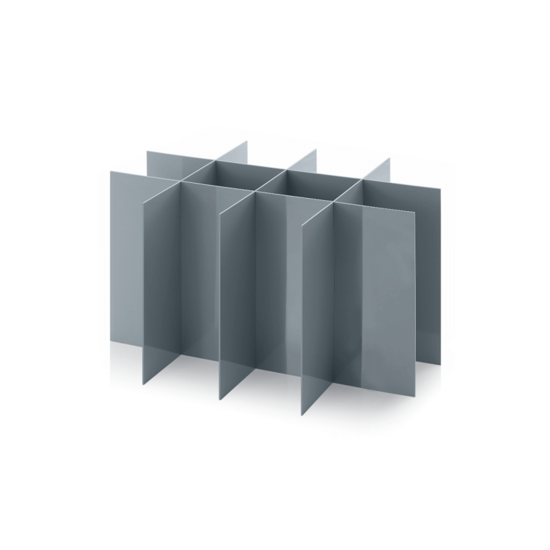Der RACKY® Flaschen-Unterteiler kann in die RACKY® Box 40 x 30 x 22 cm, 40 x 30 x 27 cm oder 40 x 30 x 32 cm eingelegt werden. Sie erhalten so 12 Flaschen-Unterteilungen in der Box.